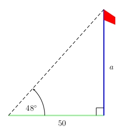 Let \(a\) denote the height of the flagpole. Then \(\dfrac{a}{50}=\tan48^\circ\), so \(a=50\tan48^\circ\approx55.5\) ft.