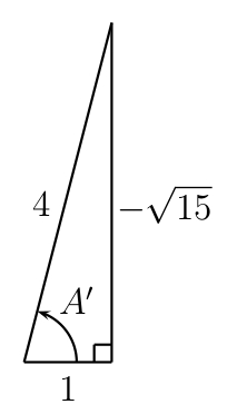 The triangle above is an example of a 'pseudo-triangle' since one of its sides is negative. The angle \(A^\prime\) is actually the reference angle of the angle \(A\), but if we take into account that one or both sides (never the hypotenuse) may be negative then the trigonometric ratios of the reference angle will give the correctly signed value for the trigonometric values of \(A\) in the respective quadrant.