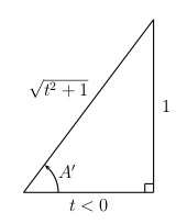 If we correctly label the pseudo-triangle for a second quadrant angle, the task becomes simple. In the second quadrant, the adjacent side is negative and the opposite side positive, since the signs of the sides of a pseudo-triangle always take the respective signs of the \(x\) and \(y\) coordinates on the given quadrant. Since the angle is in quadrant II and we are given that \(\cot A=t\) we label the adjacent side \(t\) (which must be negative in quadrant II) and the opposite side \(1\).