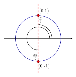 Draw the unit circle and draw a vertical line through \(0\) on the horizontal axis. The two points where this vertical lines crosses the unit circle represent the solutions to the equation, since every angle whose cosine is zero will have a terminal side which passes through one of these two points. The coordinates of these two points are \((0,1)\) and \((0,-1)\).