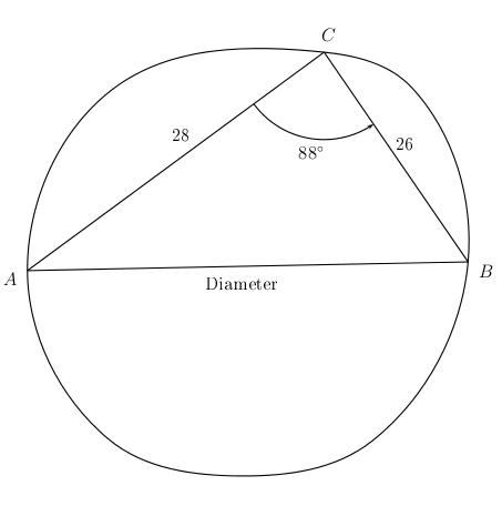 \( | AB |^2 = 28^2 + 26^2 – 2 (28)(26)\cos88^\circ=1409.2\) So, \(| AB | ≈ 37.5\) feet.